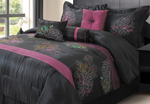 7 Piece Queen Alexandra Black and Purple Embroidered Comforter Bedding Set Review